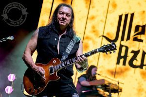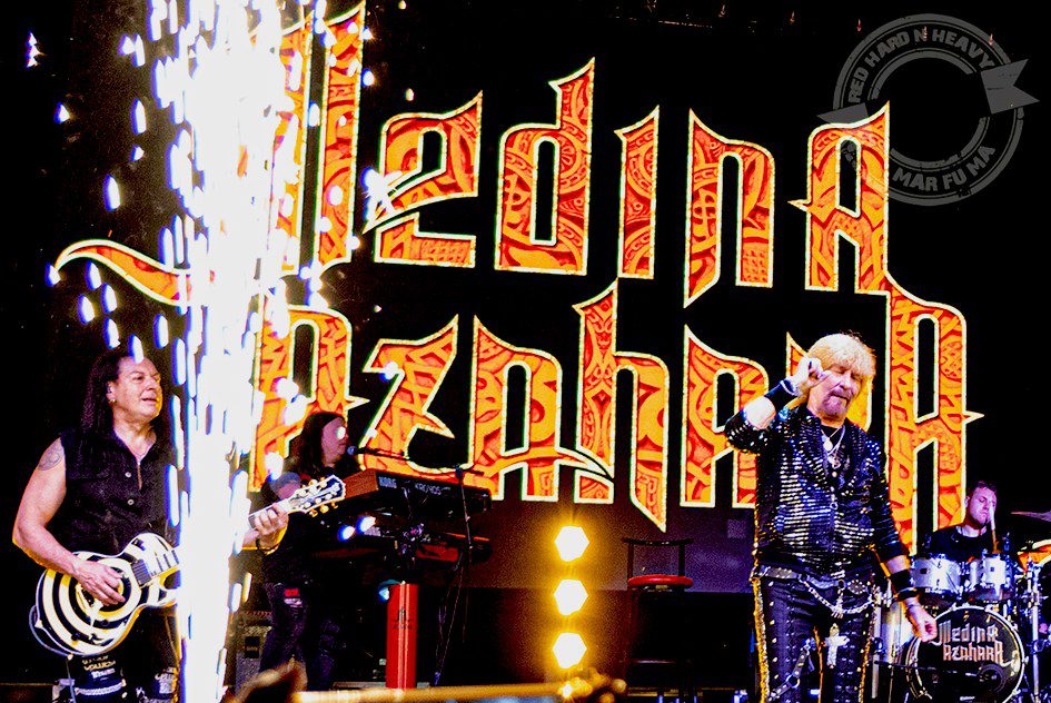 En medio de todo eso, no faltaron varios agradecimientos a la ciudad de León y a sus ciudadanos, que esta noche tampoco fallamos a la cita. Paco Ventura se mostró en todo momento muy animado y sonriente, intercambiando con el público numerosos guiños y saludos. Y por supuesto, presumiendo de sus preciosas guitarras, la Gibson Les Paul Standard, la Flying V Michael Shenker y una Wylde Odin Grail (recordando a la de Zakk Wylde), de las que el virtuoso cordobés sacó extensos solos afilados y sentidos, con sus manos y hasta con sus dientes (y fue curioso ver sus discretos sorbitos de vino en copa fina, aprovechando los cambios de instrumento). Tan emocionado estaba que se atrevió a decir que, después de conocer la noche anterior el Barrio Húmedo de la capital leonesa, ¿quién sabe? tal vez vuelvan a pasar por aquí… Paco Ventura, ojalá sea así, y esta noche no sea la última.El tercer miembro que en este momento representa a MEDINA AZAHARA, el siempre premiado como «mejor teclista» Manuel Ibáñez, también demostró por qué se lleva tantos premios. Y aunque estuvo casi todo el tiempo pertrechado al fondo entre sus dos teclados fijos, nos deleitó con sus solos excelsos, sus coros potentes, e incluso un par de duelos con la guitarra de Ventura, siempre muy expresivo y bien integrado. Y también nos gustó verle más de cerca con su sintetizador inalámbrico.