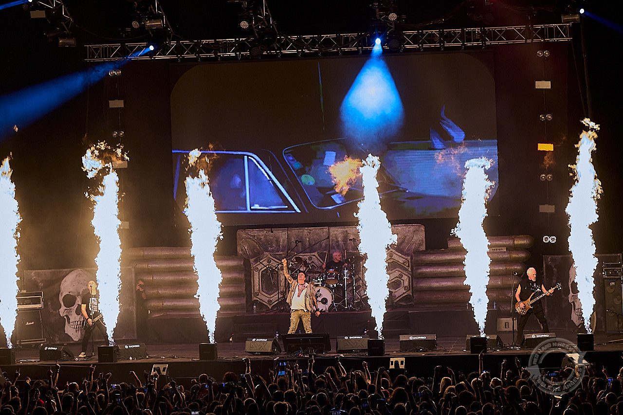 Continuarían el show con “Pesadilla Nuclear”, imprescindible, y otra joyita “actual” como es “Siento Ganas”, haciendo las delicias del público que se sabía cualquier tema. En “Te Visitará la Muerte” las pantallas ponían imágenes genéricas de cementerio, y a su vez es lo único que me gustó menos del concierto, que la mayoría de imágenes que proyectaron eran muy genéricas y básicas, y no aportaban nada al show, como suele pasar en muchos conciertos, siendo incluso “cutres” en algún momento. Para eso yo personalmente prefiero que pongan el logo de la banda y nada más, o hubiera estado bien subir el logo de los 80 y quitar la pantalla. Ellos lo hicieron con su mejor intención pero es cierto que es lo que menos funcionó del show.