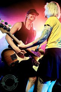 Pero, sin duda, íbamos a ver a THE BABOON SHOW, que casi llenaron la sala de adeptos antiguos y nuevos. Vi a una banda muy unida, muy cohesionada y cómplice, con mucho poder de atracción y de captar las miradas en sus cuatro miembros… Pero es inevitable. Lejos de divismos mal entendidos o egos desmesurados, Cecilia Boström es el núcleo de ese volcán ardiente, el foco del estallido del ritmo velocísimo, agresivo y divertido, jocoso y sudoroso. Por supuesto que no podría hacerlo sin la aportación de sus compañeros, y se nota que lo sabe, pero es un auténtico «animal de escenario», salvaje e indomable, imparable, buscando el contacto piel con piel con los fans, porque también sabe y reconoce que, sin ellos, tampoco.