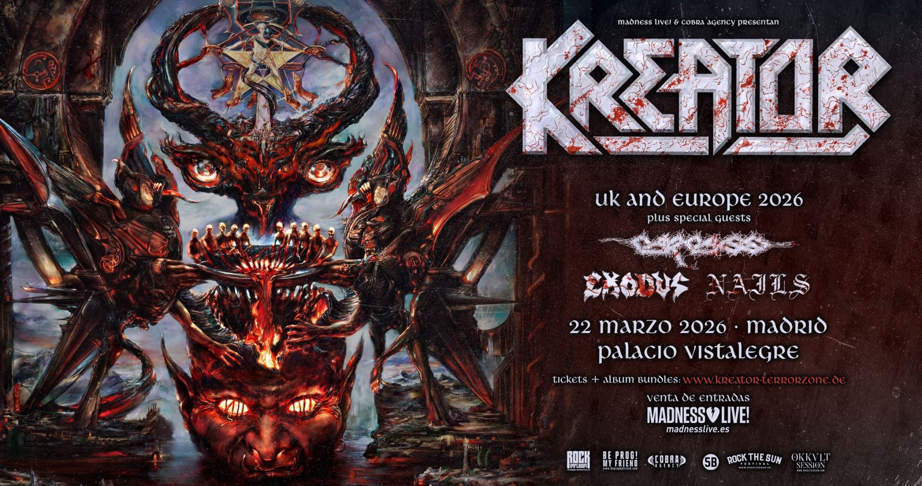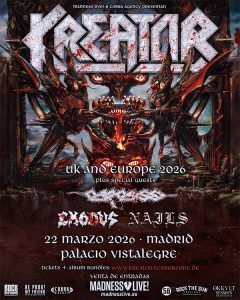 La primavera empieza dura, y qué mejor que ir a ver a KREATOR acompañados de CARCASS, EXODUS y abriendo NAILS en Madrid, el proximo domingo 22 marzo 2026. Noche imprescindible de tralla que no nos podemos perder. ¡Os lo contamos!